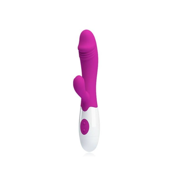 Vibrador com ponta em formato de glande e estimulador clitoriano. Possui 10 modos de vibrações.