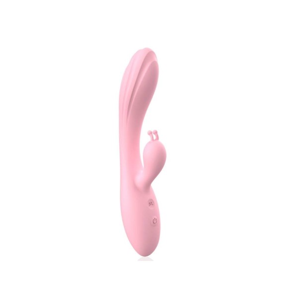 Vibrador recarregável com detalhe de glande com estimulador clitoriano formato coelho. Possui 12 modos de vibração.