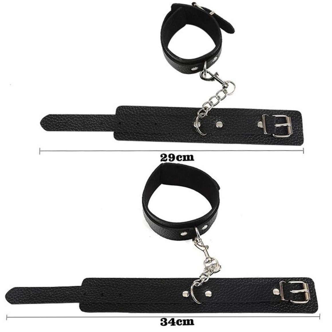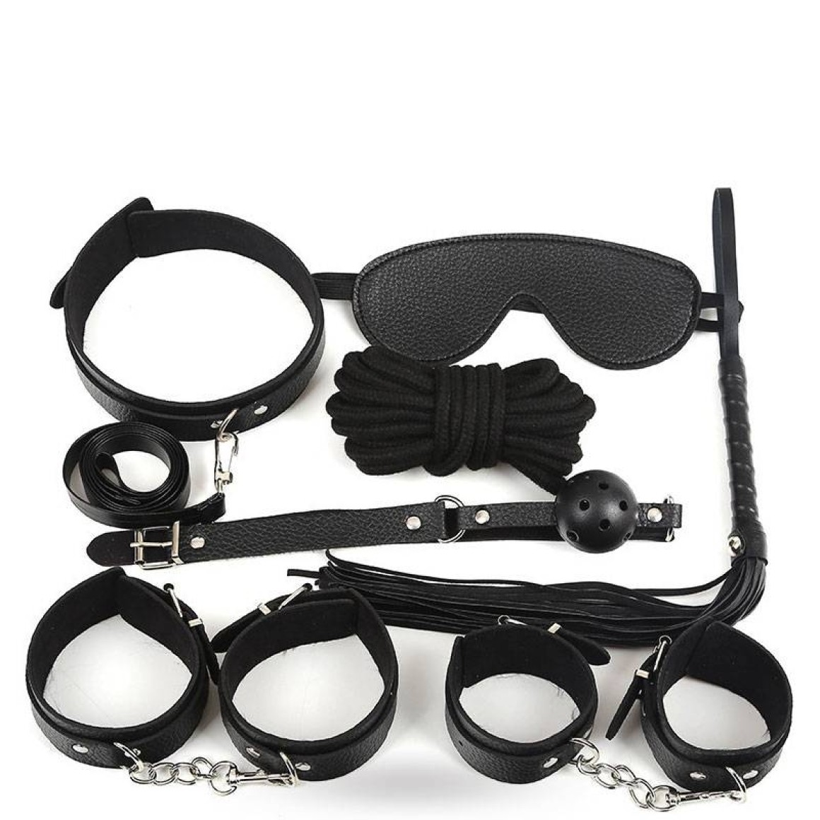 Kit bondage com 8 peças. Possui: 1 venda, 1 mordaça, 1 par de algemas,