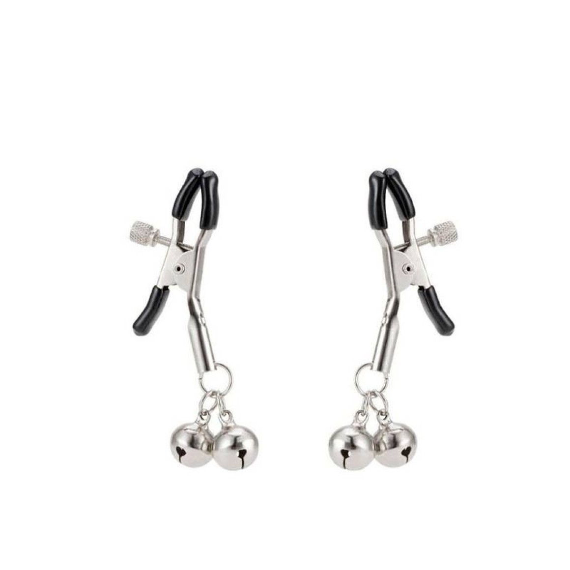 Grampos para mamilos com guizo duplo com presilhas ajustáveis . Material: Metal