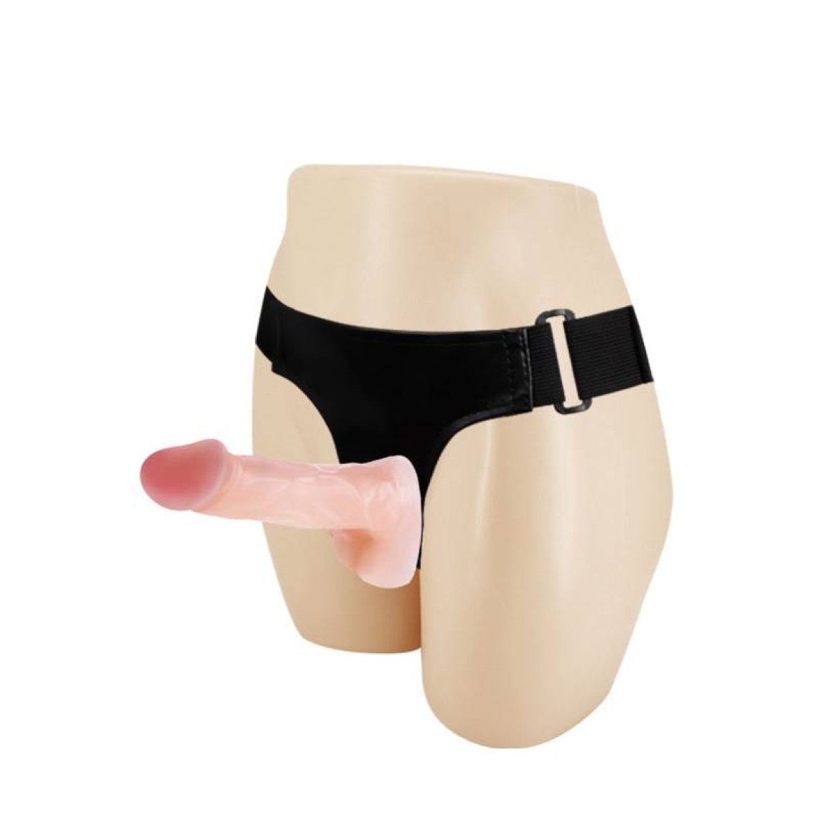 Cinta peniana com 2 próteses, sendo uma com escroto, veias saliente e outra com glande e veias massageadoras, cinta reforçada e ajustável.