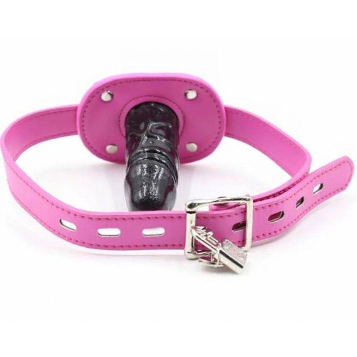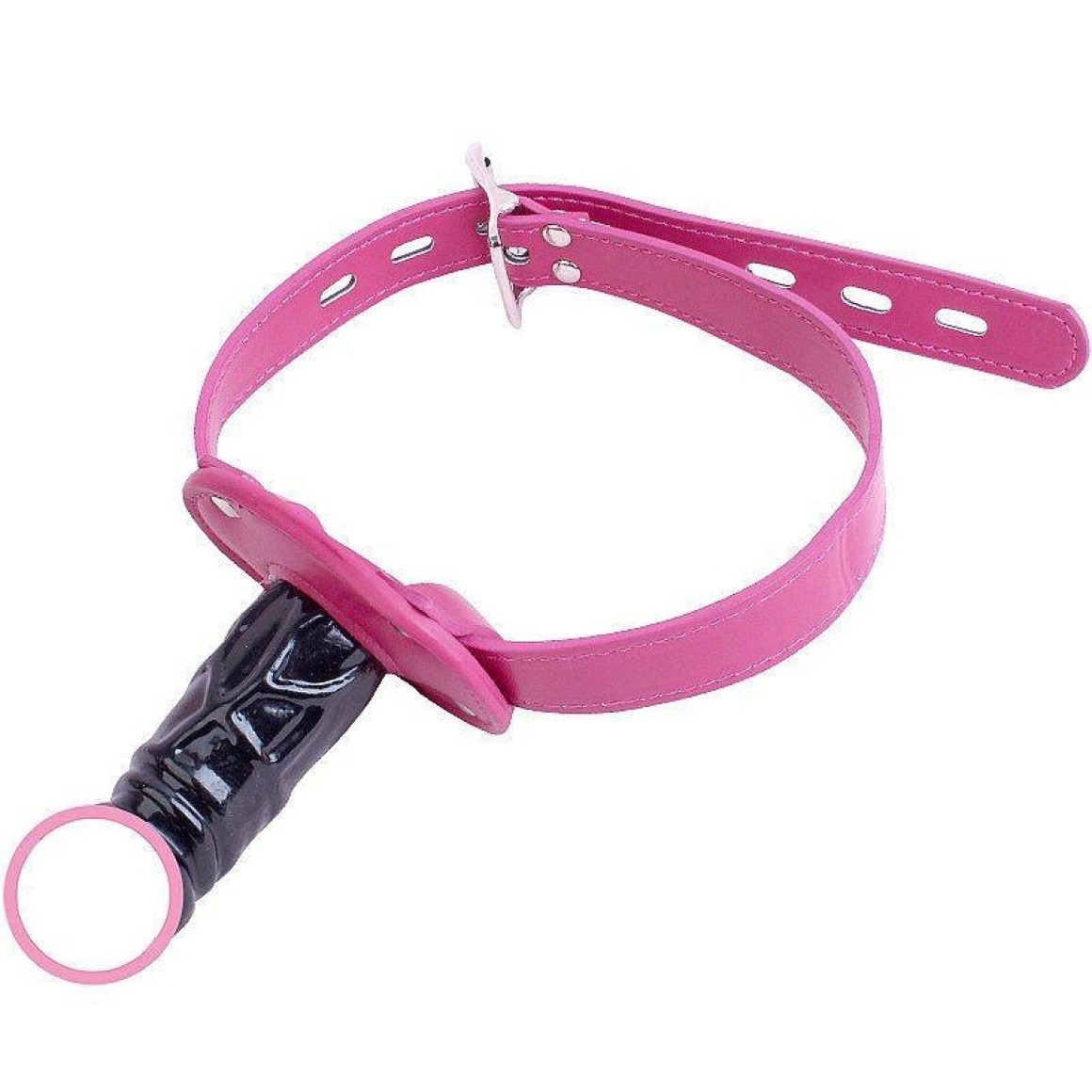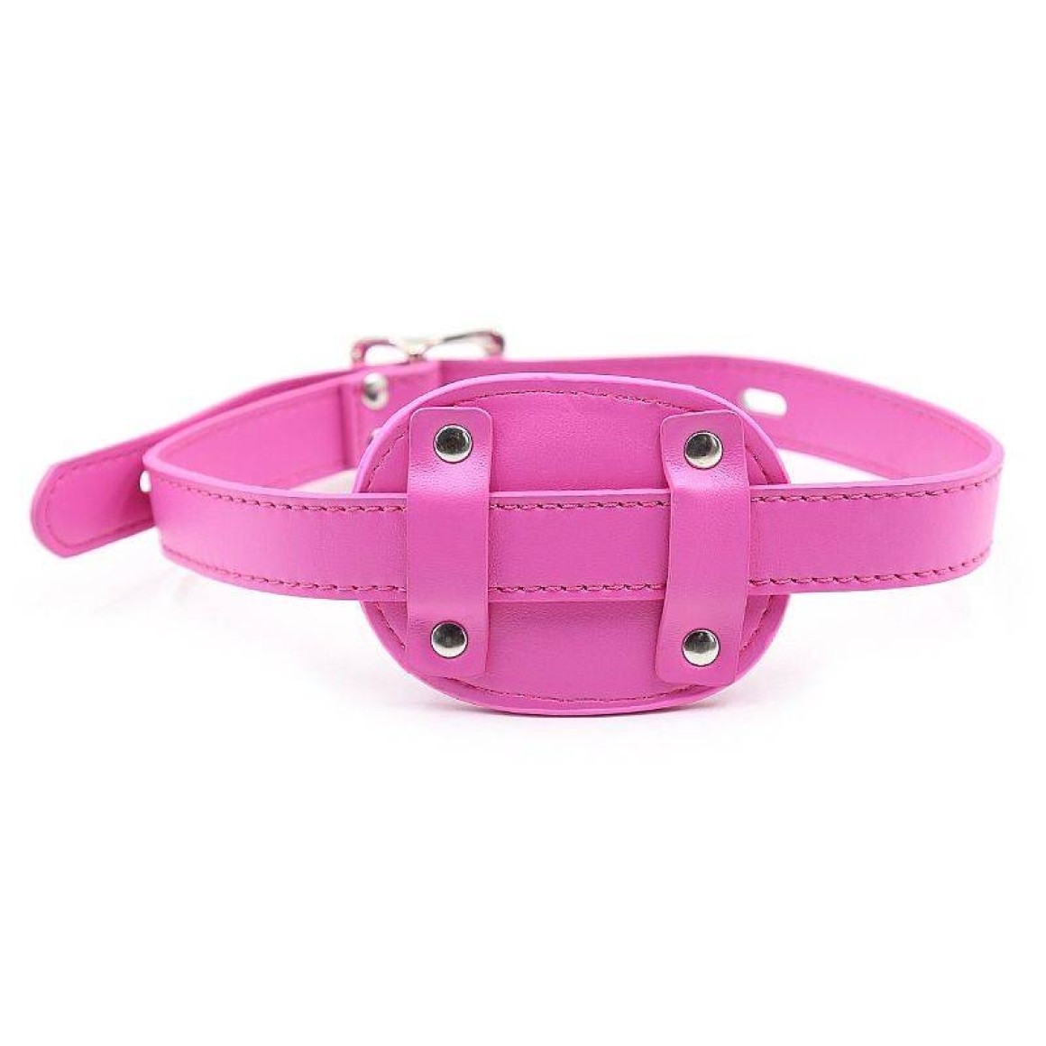 Mordaça bondage ajustável por meio de fivelas metálicas, confeccionada em couro sintético.