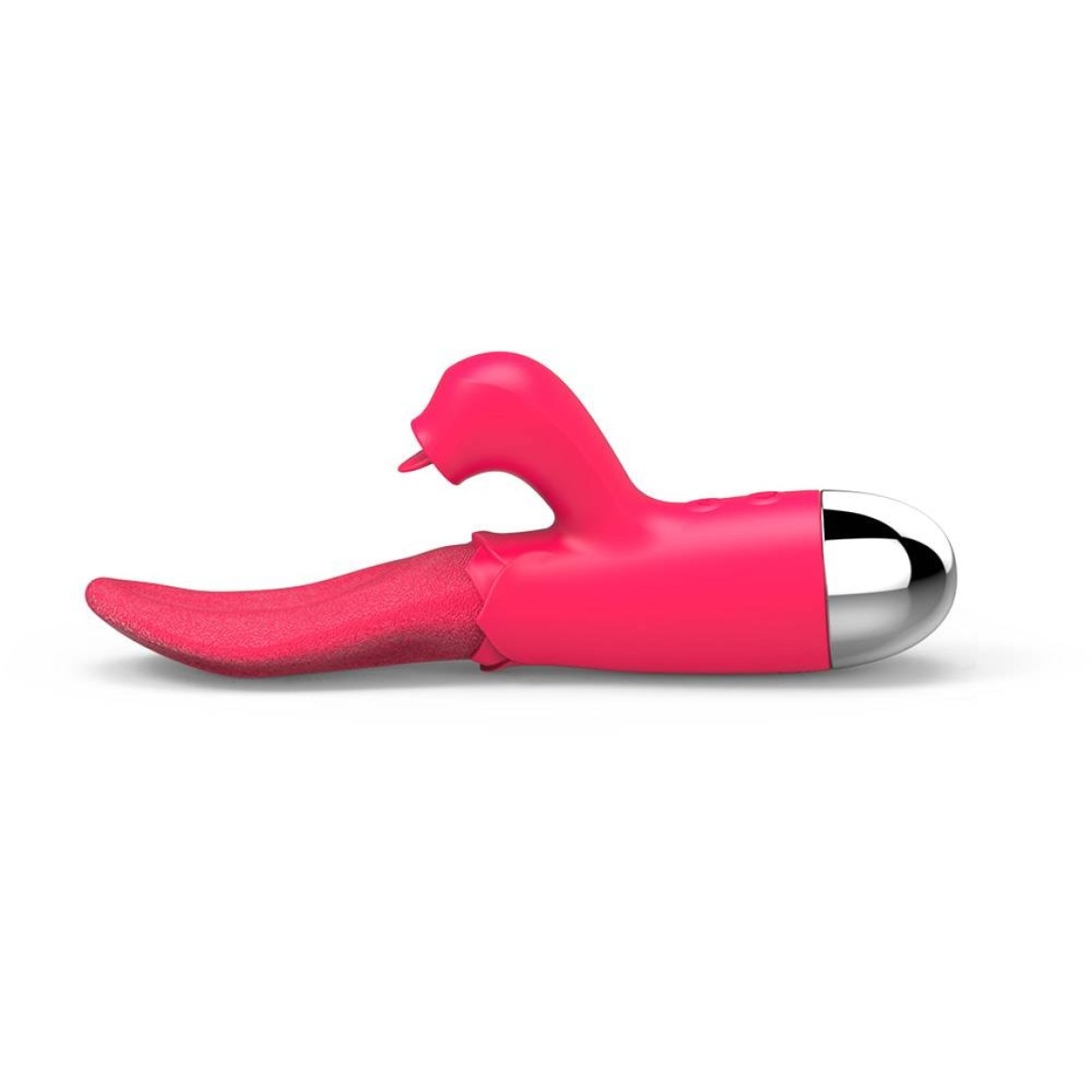Vibrador projetado para proporcionar dupla estimulação, com massagem no clitóris e penetração vaginal simultaneamente. Seu design apresenta uma glande ligeiramente curva, flexível e saliente, reproduzindo a forma de uma lígua humano.